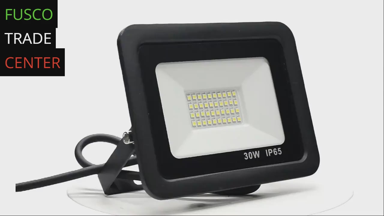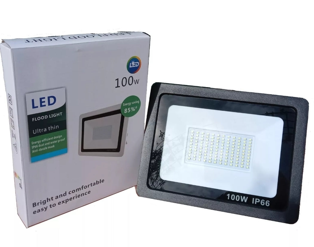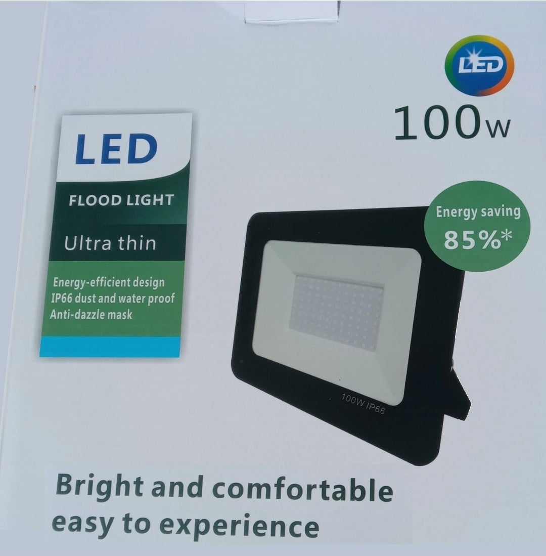 Fari proiettori led 100 watt a risparmio energetico, set da tre pezzi, ultra sottile, marca Fusco Trade Center, 8500LM, 120 led, classe impermeabilità e protezione IP66, temperatura colore 6000K, vetro temperato resistente agli urti, telaio in alluminio pressofuso colore nero, produttore Sunrise Lighting Sea&Mew, lotto di produzione Dicembre 2024.