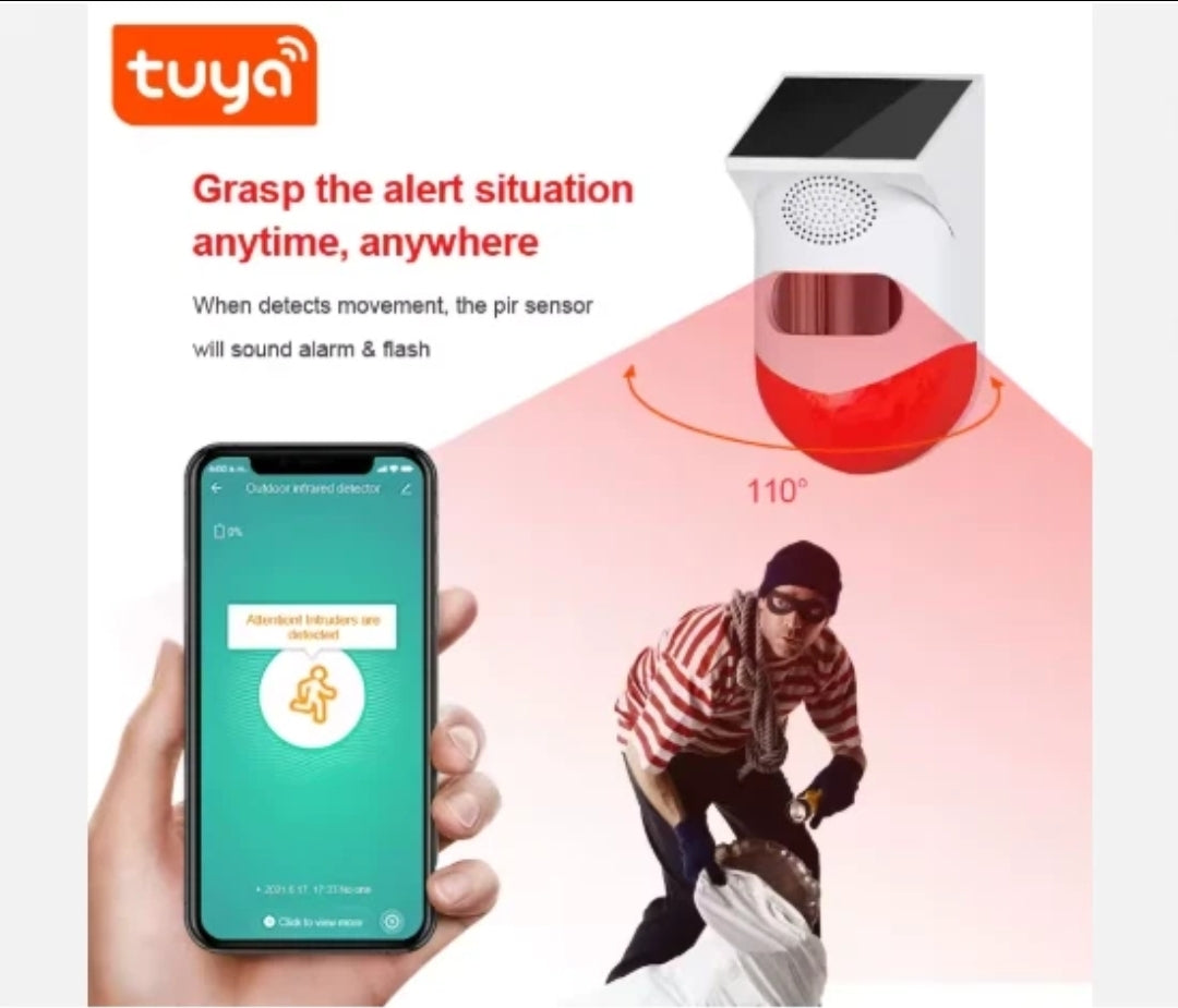 Il sensore di movimento a infrarossi per esterni si collega facilmente via WiFi a 433 MHz e include una sirena integrata con allarme luminoso e sonoro da 120 dB. Dotato di batteria al litio da 3,7V 600mAh con ricarica solare, offre fino a 30 giorni di autonomia anche senza luce diretta. Rileva movimenti fino a 10-12 metri con un angolo di 110 gradi e si controlla tramite l’app gratuita Tuya Smart, che invia notifiche immediate. Con certificazione IP65, resiste a polvere e acqua, garantendo protezione affidabile per ogni spazio esterno.